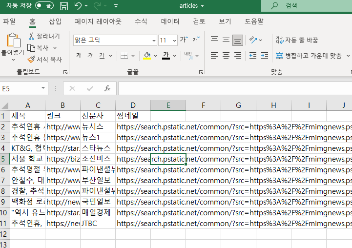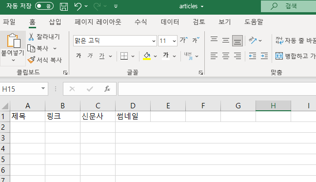 ws1.append(["제목", "링크", "신문사", "썸네일"])