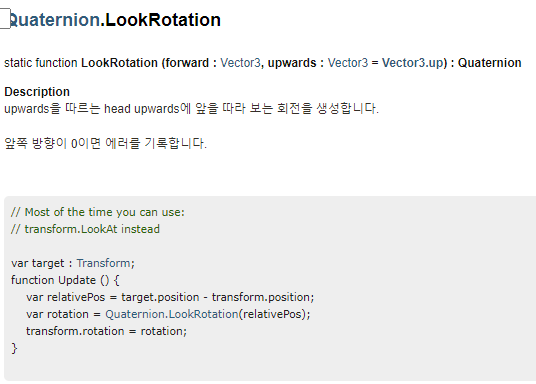 LookRotation() 메서드는 해당 벡터 방향을 바라보는 회전 상태를 반환한다.