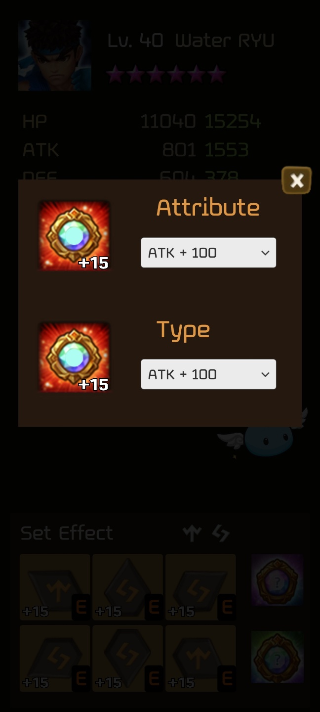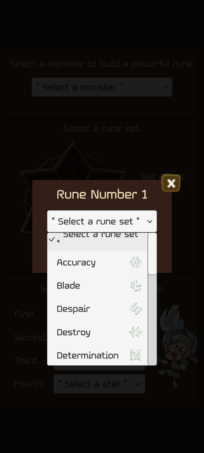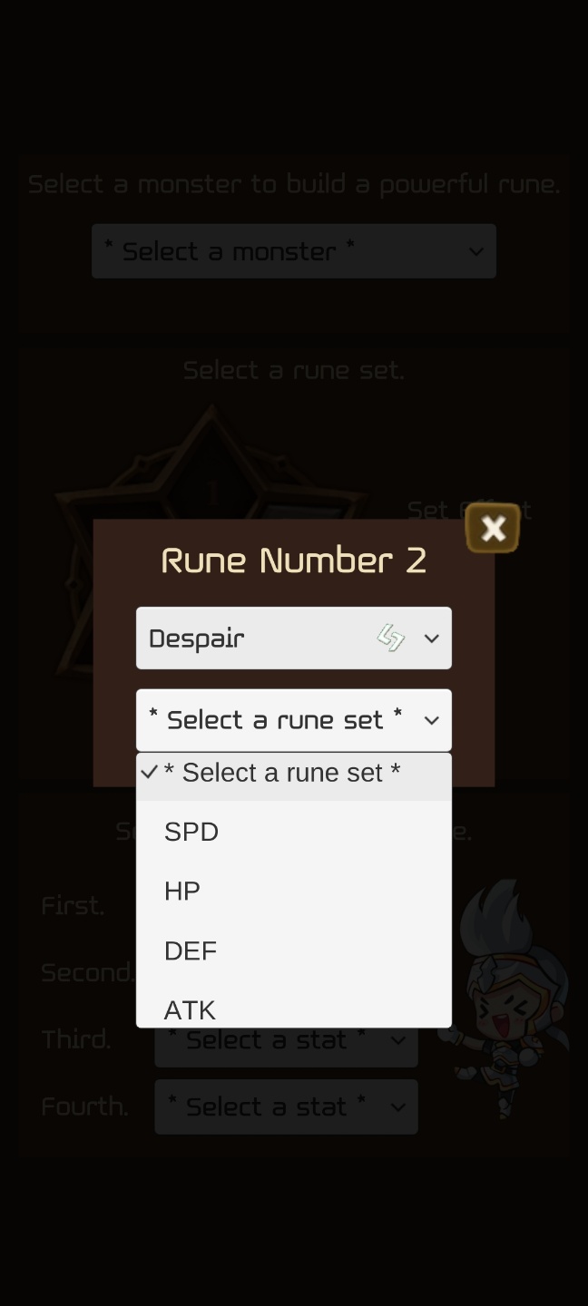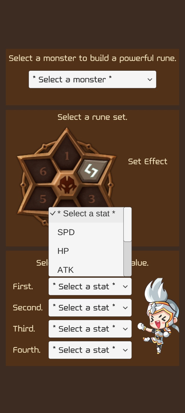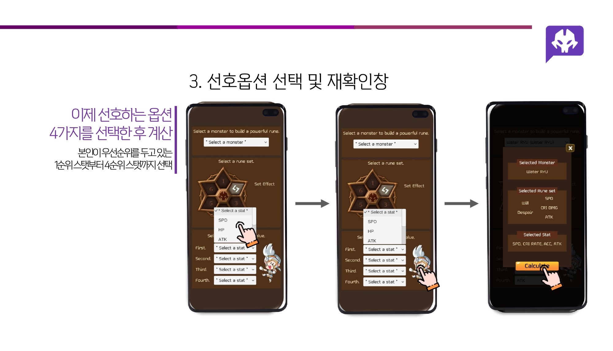 - 몬스터 선택, 룬 선택 및 선호하는 스탯 선택화면
