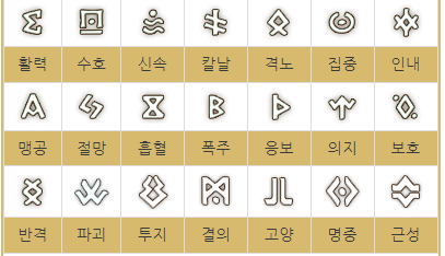 룬은 아래 그림과 같은 종류들이 있으며 몬스터의 특징과 사용용도, 타입에 따라서 다양하게 사용할 수 있다.