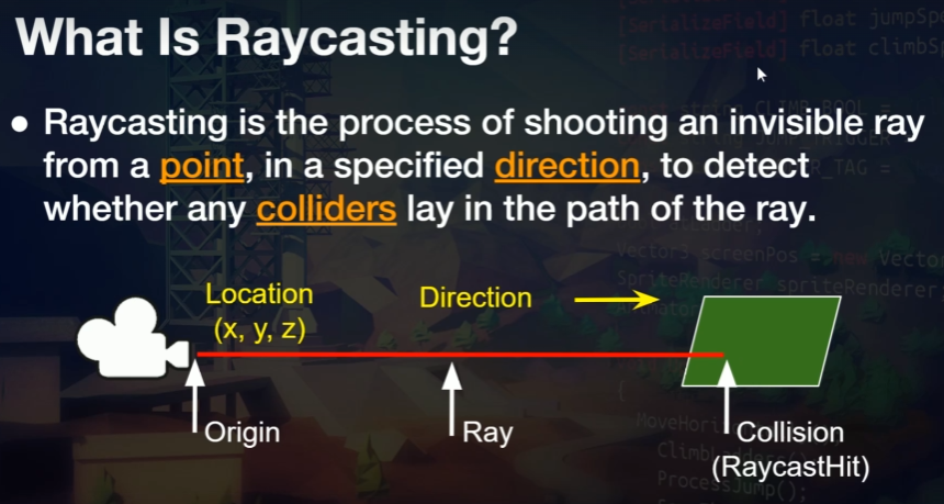 | Raycast | Casts a ray, from point origin, in direction direction, of length maxDistance, against all colliders in the scene. |