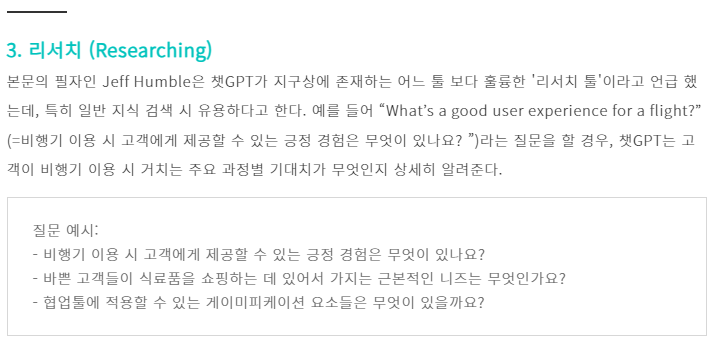 Chat GPT에게 자료조사를 시키고 이를 기반으로 원하는 정보를 얻어오는 것이 궁극적으로 우리가 원하는 것이기에 잘 활용한다면 획기적으로 시간과 비용을 절약할 수 있을 것이다.