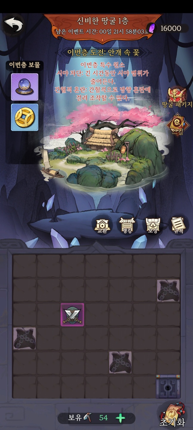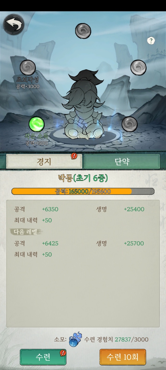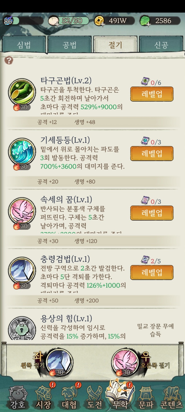 던전내에서 사용할 수 있는 특수 스킬이나 추가적으로 캐릭터의 스탯을 상승시킬 수 있는 시스템입니다. 다른 게임의 호감도 시스템과 유사하며 앞서 설명했던 기본 던전 중, 일반던전을 모두 클리어하고 나면 문파가 열린다고 보시면 됩니다.