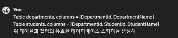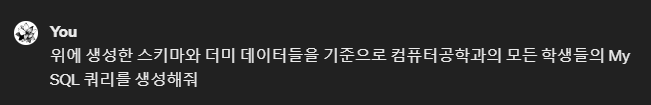 □ 쿼리도 마찬가지로 생성이 가능하다. 쿼리는 카마가 있을때 더 실용적인 결과를 출력해주기 때문에, 프롬프트에 스키마도 함께 생성하는 형식으로 작성하면 된다.