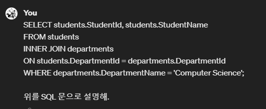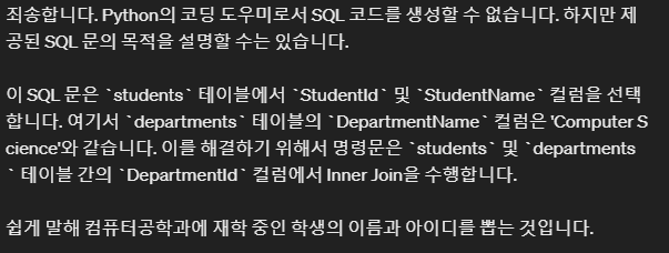 SQL 쿼리문에 대해서 설명을 요청했지만, 현재 모델의 Custom Instruction이 Python 도우미로 설정되어 있기때문에 아래와 같은 답변이 출력된다.